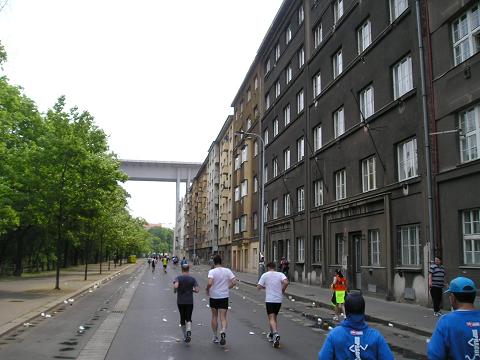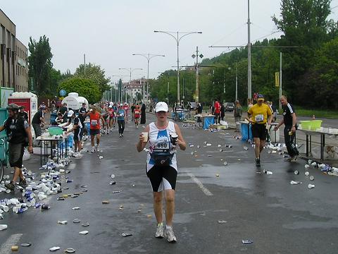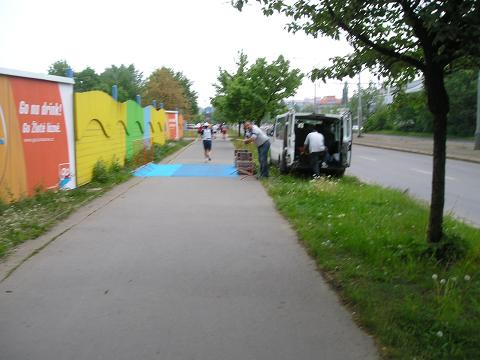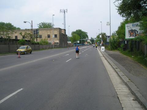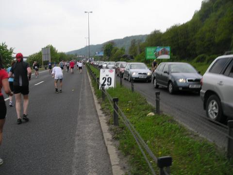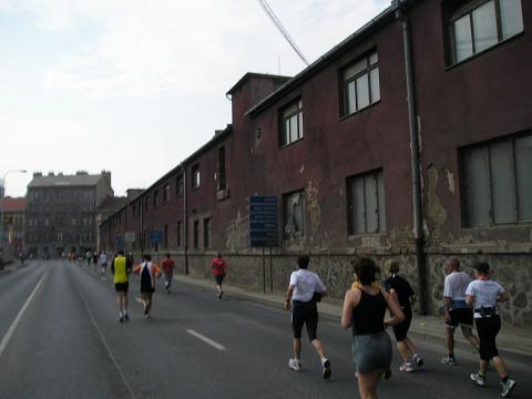 Kilometer 37: Strakonická Der schlimmste Teil der langen Autobahnpassage war geschafft und es gab wieder ein paar Gebäude zu sehen. Zuschauer waren aber weiterhin mehr als zufällig. Zuletzt hatte ich mich mit neun Minuten pro Kilometer dahin gequält und eigentlich nur noch von einem Verpflegungsstand zum nächsten gedacht. Die Verpflegung in Prag war im übrigen erstklassig!! |