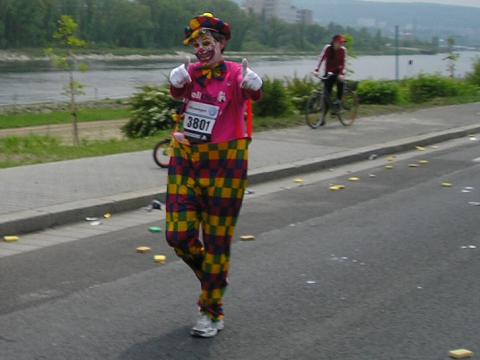 Kilometer 30: Strakonická Mein Freund der Clown, den ich sowohl am Start als auch hier als auch kurz nach dem Finish traf. Außer uns beiden waren nur eine handvoll Leute in Verkleidung gestartet. Und der Clown war der Beste! |