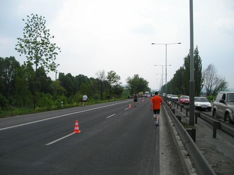Kilometer 29: Strakonická Also das Laufen auf der einer Seite der Autobahn war nun mit Abstand das langweiligste Stück Marathon-Strecke, das ich je gelaufen bin. Und das sollte insgesamt 14 (!!) lange Kilometer genau so aussehen. Sieben Kilometer nach Süden und dann dieselben sieben Kilometer wieder nach Norden. Immerhin, wir Läufer waren schneller unterwegs als die Autos rechts, die wegen uns im Stau standen. |