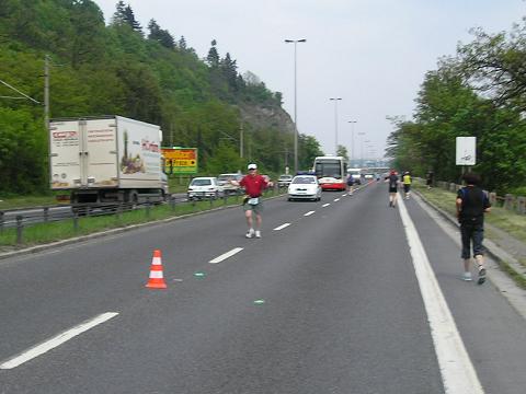 Kilometer 18: Podolske nabrezi Gleich hinter dem Tunnel unter Vysehrad bot sich ein toller Blick südlich auf die Moldau und die Läufer bei Kilometer 22,5. Ich schaffte Kilometer 18 bei 1:58 Stunden, fühlte mich aber nicht mehr ganz so gut. |