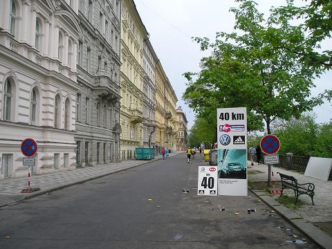 Kilometer 40: Janáckovo nabrezi Zurück im belebten Teil Prags. Auch wenn dieses Kilometer- Schild auch seht einsam in der Gegend herumstand, kam nun endlich wieder etwas Stimmung auf. Und schon fiel auch mir das Gehen etwas einfacher. Die Schmerzen im Magen und in den Beinen waren nur noch halb so schlimm. Das nahende Ziel tat natürlich ein übriges. |