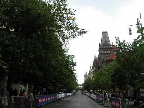 Kilometer 41,8: Parizská Auf der rechten Seite das jüdische Viertel. Die Startgerade wurde nun zur Zielgeraden. Und auch hier nur sehr vereinzelt Leute. Die Meisten saßen in den Cafés am Rand und freuten sich, daß es entgegen allen Voraussagen nicht regnete. |