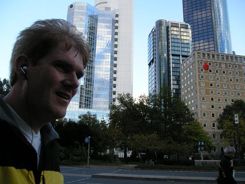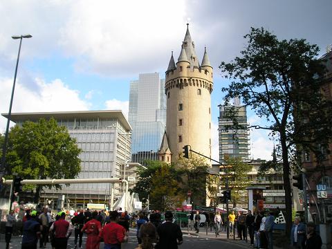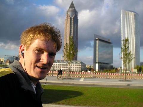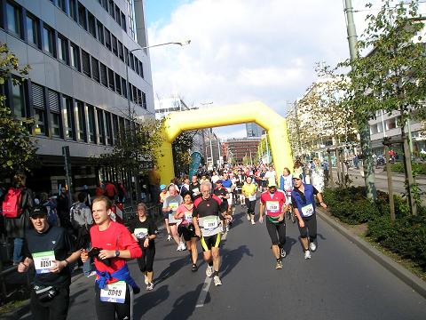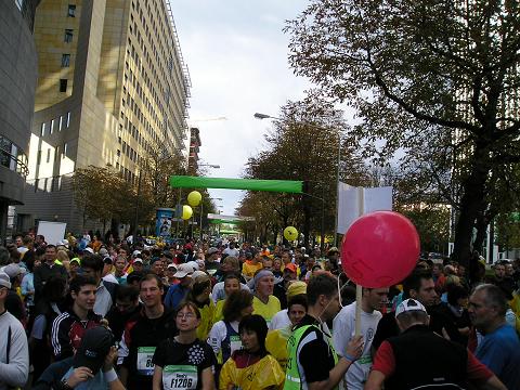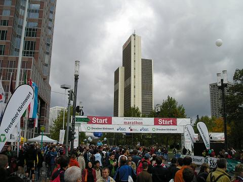 Theodor-Heuss-Allee 10.54 Uhr Kurz vor dem Start haben sich rund 11200 Läufer um den Messeturm herum aufgereiht und warten auf den Startschuß. Der Wetterbericht versprach uns Dauerregen, Sturm und kalte Temperaturen. Nun ja... es waren 16°C und es war leicht bewölkt. Aber doch sehr windig. |