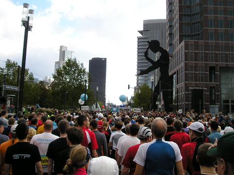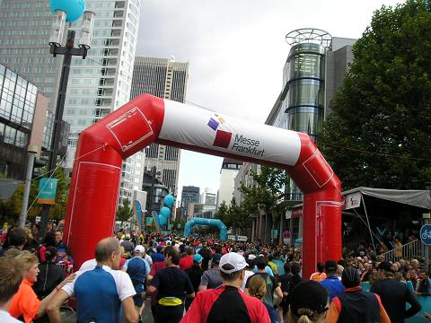 Messe Friedrich-Ebert-Anlage 11.10 Uhr So langsam schob sich auch das Hinterfeld in Richtung Start. Rechts der Messeturm und der Hammering Man, der 42 Km später die letzte Kurve in Richtung Festhalle anzeigen wird. |