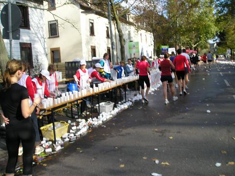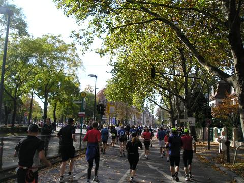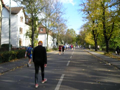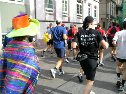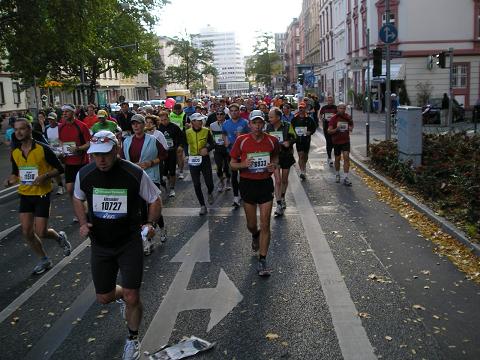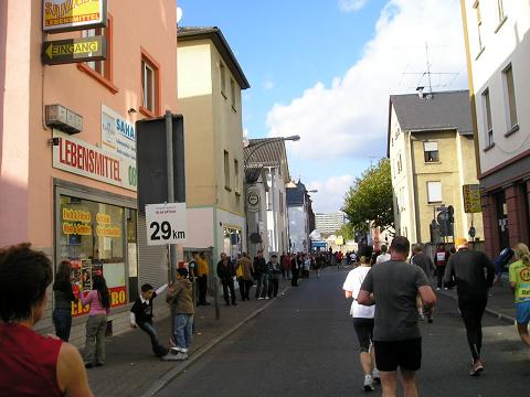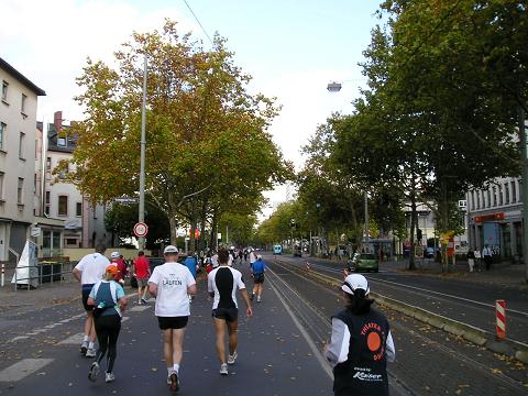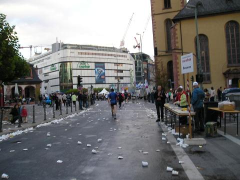 Taubenstraße Eschenheimer Tor Kilometer 10 1:04:50 Stunden war eine sehr ordentliche Zeit und machte klar, daß ich wieder in meinem Rennen war. |