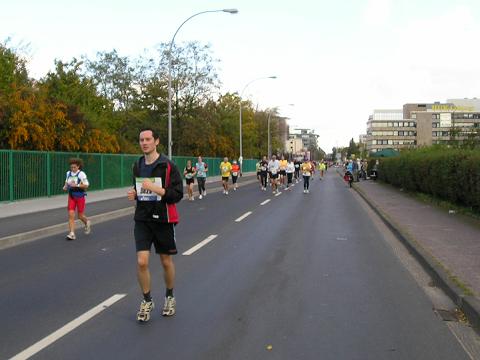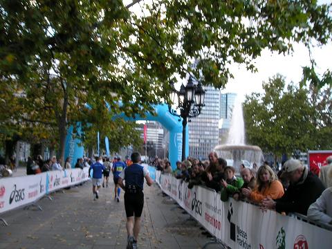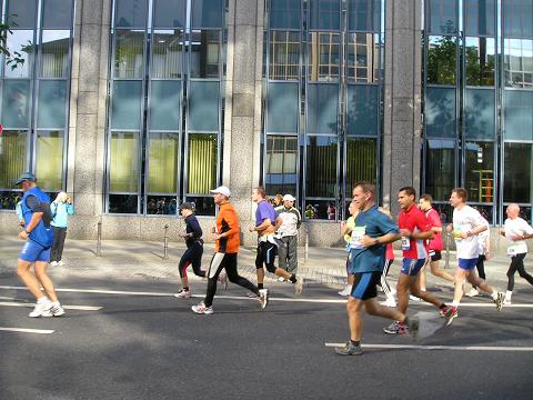 Landstraße Kilometer 38 Zurück in der Innenstadt. Zum vierten Male passierten wir nun dieses Teilstück. Noch immer standen Tausende Zuschauer an der Strecke und feuerten jeden Läufer an. Ich holte mit letzter Kraft den enteilten Tempo-Läufer und seine Gruppe wieder ein. |