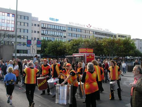 Konstablerwache Kilometer 11,1 Die Stimmung am Straßenrand war grandios. Nie habe ich so viele Musikgruppen und Trommler erlebt wie hier in Frankfurt. Auch außerhalb der Innenstadt war an fast jeder Ecke eine Party. |