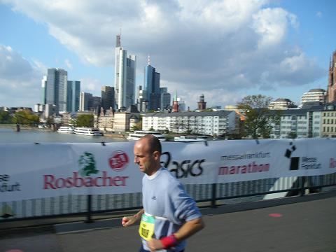 Brücke Kilometer 11,8 Nun ging es über den Main auf die Südseite. Im Hintergrund die Skyline der Bankentürme. Mir ging es immer noch gut, hatte mich längst gut in mein Tempo hereingefunden. |