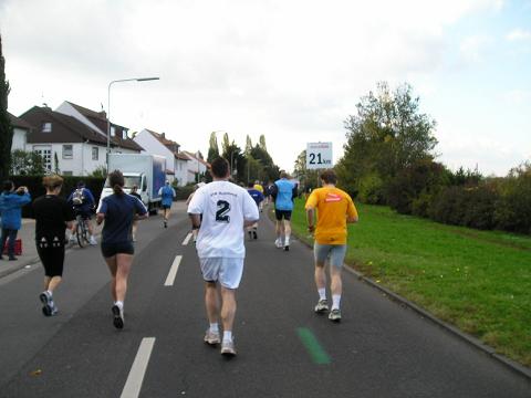 Frankenfurt Kilometer 21 Halbmarathon. Nachdem mich nette Anwohner von Frankfurt- Goldstein mich noch mal so richtig motiviert hatten, kam ich mit 2:18:34 Stunden bei der Halbmarathon-Marke an und unterbot meinen bisherigen Rekord von Bremen um zwei Sekunden. |
