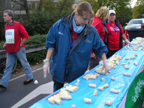 Bolongarostraße Kilometer 30,3 Nun erwischte es mich. Hinter diesem Verpflegungsstand legte ich die erste Gehapuse ein. Da half es auch wenig, daß ich endlich an meine Coca-Cola kam (siehe den roten Schirm am Ende der Tischreihe). Die Streckenverpflegung war mit der einen Coca-Cola-Panne hinter Kilometer 25 perfekt!! Ein großes Lob an alle Helfer. |