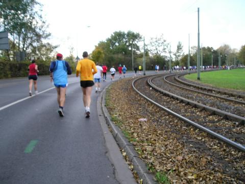 Adolf-Miersch-Straße Kilometer 16,6 Es wurde etwas leerer um mich herum, aber ich hielt mein Tempo, wenn gleich ich immer das Gefühl hatte, es ging mir nicht so gut wie fünf Wochen zuvor in Bremen. |
