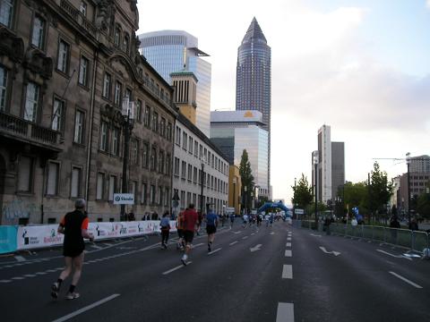 Friedrich-Ebert-Anlage Kilometer 41,5 Das Ziel vor Augen (oder zumindest einmal den Start). Der Messeturm zeigt an, wo die lange Reise ein Ende finden wird. Direkt voraus aber erst noch der Startbogen, wo knapp 290 Minuten zuvor alles begann (jetzt Kilometer 41,9). |