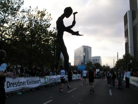 Der Hammermann vor dem Frankfurter Messeturm könnte eigentlich die ideale Skulptur für den Marathon sein. Obwohl hier bei Kilometer 42 kaum ein Läufer noch vom Hammermann getroffen wird und einbricht. Der "Hammering Man"