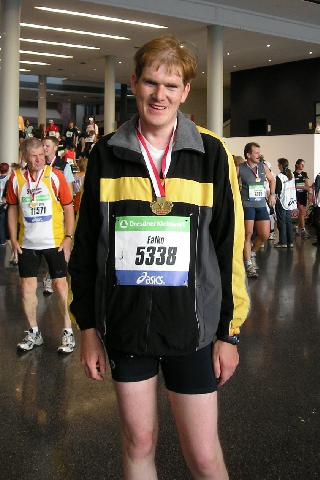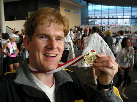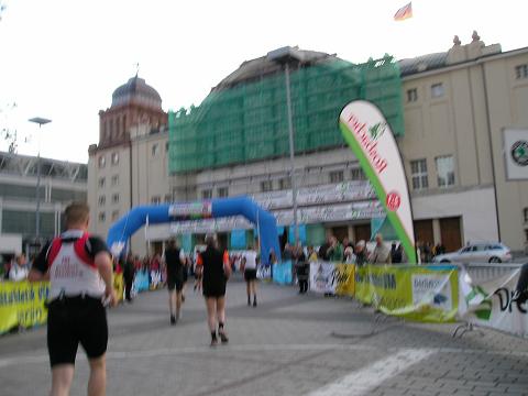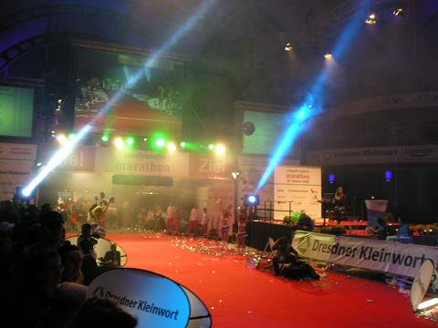 Festhalle Kilometer 42,15 Endlich da. Noch 60 Meter auf dem roten Teppich durch die Lichtshow und die jubelnden Zuschauer durch und dann war es geschafft. Irgendwie ging das viel zu schnell, so daß man es leider gar nicht gebührend genießen konnte. |