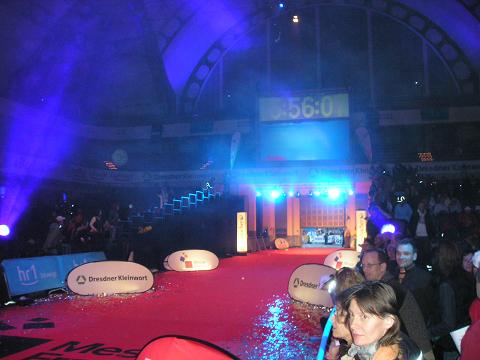 Der Zieleinlauf des Frankfurt Marathons findet auch hier in der Halle statt. Der Zielbogen war auch schon aufgebaut (unter den Großbildleinwänden) und ließ die Vorfreude auf den Tag danach anwachsen. |