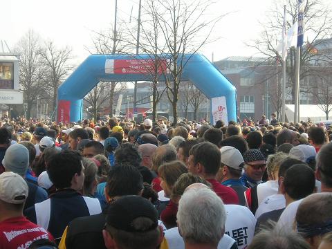 0,1 / 10.30 Uhr Deichstraße Endlich ging es los. Nachdem man vereint über die erste Verkehrsinsel direkt nach dem Start gestolpert war, ging es auf breiterer Straße weiter. Rote Startnummern: Marathon, Gelb: Halbmarathon. Blau: 10 Kilometer. |