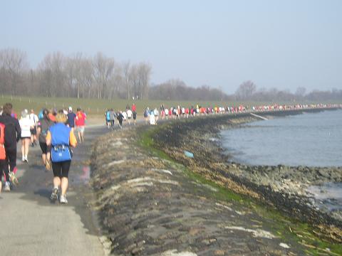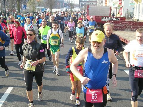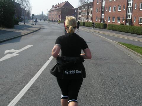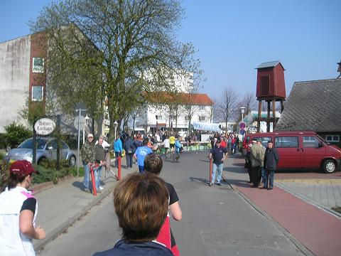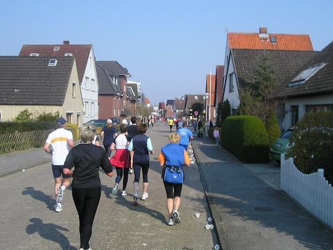 21,1 / 12.31 Uhr Deichstraße Nun ging es in die zweite Runden und es war klar, daß es nun einsam werden würde. Die Halbmarathon-Läufer waren jetzt im Ziel und so verteilten sich 241 Marathon-Läufer auf 21,1 Kilometer. Somit hatte jeder Läufer 87,5 Meter für sich ganz alleine. Und jede Gruppe von vier Läufern hinterließ ein Loch von 350 Metern. Statistisch gesehen... |