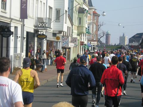 9 / 11.25 Uhr Strandstraße Südlich von Duhnen war der Wendepunkt der Strecke. Nun ging es etwas mehr als einen Kilometer den anderen Läufern entgegen, ehe es dann quer durch die Stadt zurück ins Zentrum ging. |