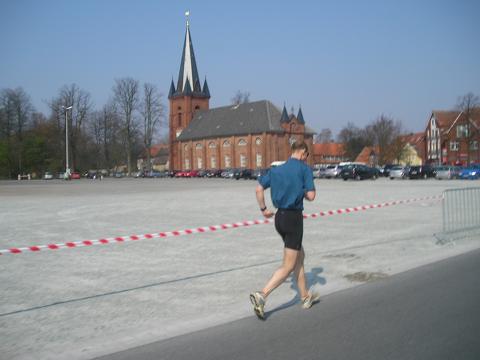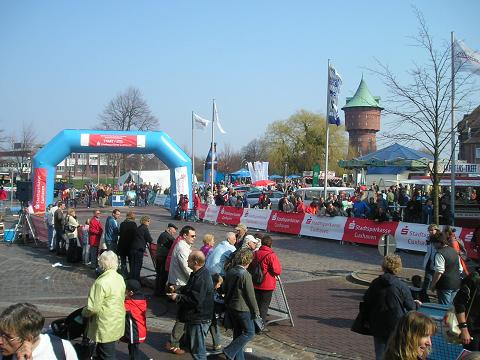 Kaemmererplatz, 9.58 Uhr Bei traumhaftem Wetter (am Morgen noch 12°C, später bis 18°C, Sonne, nur leichter Wind) versammelte sich das Laufvolk am Sonntagmorgen im Zentrum von Cuxhaven. Bereits um 9.45 Uhr waren 38 Kinder zu einem 3,1-KM-Lauf gestartet. Drei Runden rund ums Stadtzentrum. |