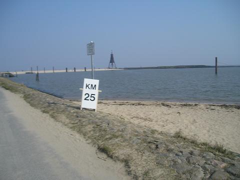 25 / 12.55 Uhr Grimmershörner Bucht / Kugelbake Mein Tempo pendelte sich bei 6:00 Minuten pro Kilometer ein. Nach der schnelleren ersten Runde kam mir das langsam vor, war aber immer noch sauschnell. Bei Kilometer 24, wo mein Vater wartete, hatte ich schon 22 1/2 Minuten Vorsprung auf meine Planzeit. |