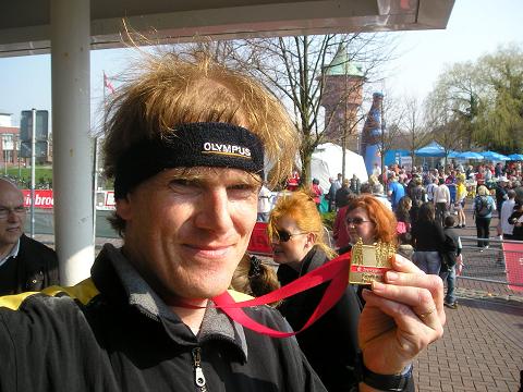42,1 / 14.56 Uhr Rohdestraße Die letzten Meter waren dann nur noch Jubel pur. Schon 500 Meter vorher hatte ich das erste Mal unter dem Applaus der Zuschauer die Arme hoch- gerissen. Auf der Zielgeraden ging es zu den Klängen von Herbert Grönemeyer ("Ein Stück vom Himmel") dem Finish entgegen. |