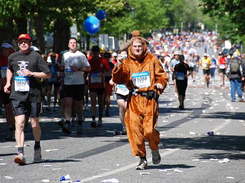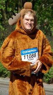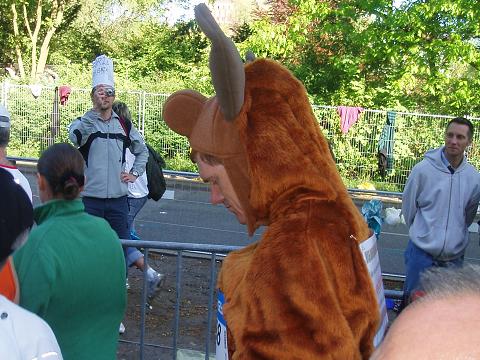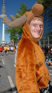 9.38 Uhr / Kilometer 4 Holländische Reihe (glaube ich) So sieht das also aus, wenn einer im Elch-Kostüm rennt. Verwirrend für mich war, daß mich viele Leute als "Hase" erkannten und mich auch so riefen. Ha(a)se ist doch meine Nachname, der im Gegensatz zu meinem Vornamen nicht auf der Startnummer abgedruckt war. Die Lösung: kurz vor mir lief tatsächlich einer im Hasen-Kostüm und mein Geweih rutschte immer wieder zu weit nach hinten. (Foto: Rainer Prestin) |