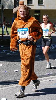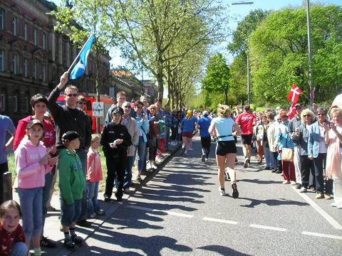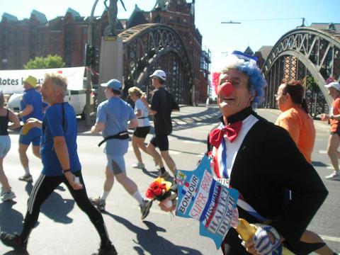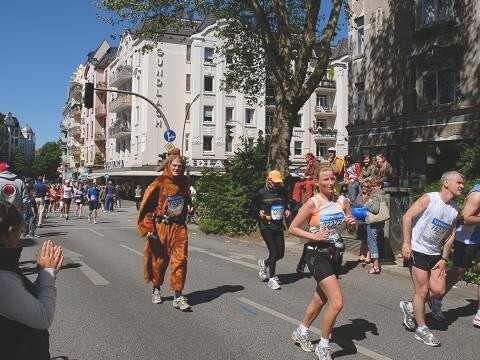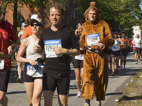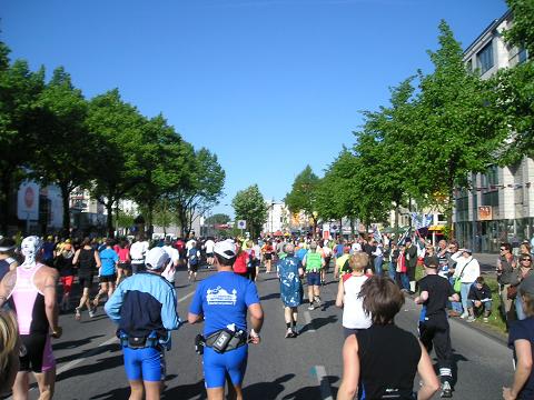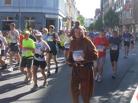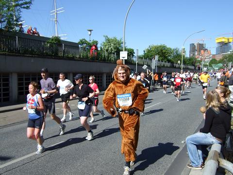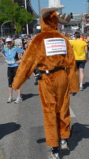 11.01 Uhr / Kilometer 16 Ballindamm Mir ging es immer noch sehr gut. Ich genoß die Stimmung entlang der Strecke und die Anfeuerungen des Publikums. Die ständige Frage, ob es nicht sehr warm unter dem Fell sei, beantwortete ich regelmäßig mit: "Nein, sehr heiß." |