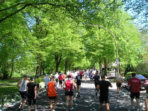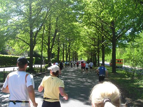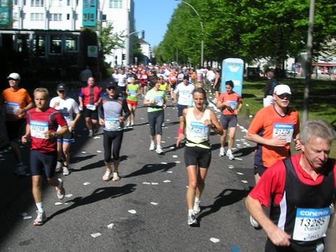 13.10 Uhr / Kilometer 34,5 Alsterkrugchaussee Für mich hatte sich nichts geändert. Ich lief weiter ein Tempo von 6:40 Minuten pro Kilometer, wobei ich insgesamt aber etwas hinter dem Schnitt zurücklag. Aber unter fünf Stunden war sicherlich drin und mein Hamburger Rekord von 2006 (4:54:09 Stunden) lag auch noch im Bereich des machbaren. Aber vor allem hatte ich immer noch einen Riesenspaß. |