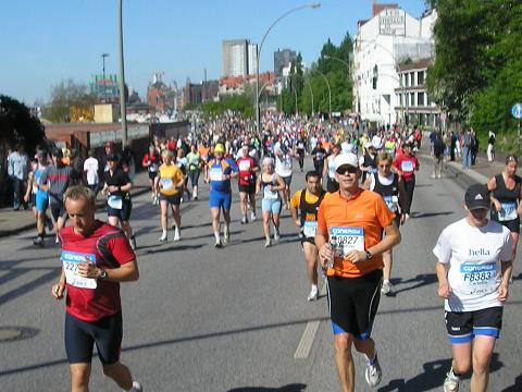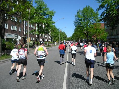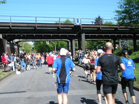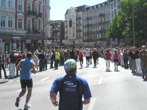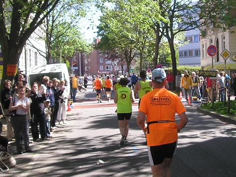 12.03 Uhr / Kilometer 25 Fuhlsbüttler Straße Oh je... wieder die "Fuhle". Keine Steigung auf dem Kurs macht mir mehr Angst als diese. Diesmal kam noch erschwerend hinzu, daß hier der Wind weg war und es nun zum ersten Mal richtig heiß unter dem Fell wurde. Aber ich biß mich die Straße hinauf. Es waren auch viel zu viele Leute am Rand, um einfach mit dem Laufen aufzuhören. |