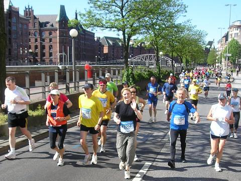 10.49 Uhr / Kilometer 14 Zippelhaus Eigentlich schade, daß wir immer nur an der Speicherstadt vorbei laufen und nie mitten durch. Mag sein, daß es sich ändert, wenn in ein paar Jahren dahinter die HafenCity fertig gestellt sein wird. |
