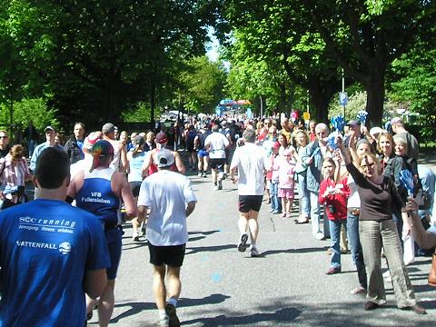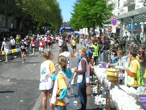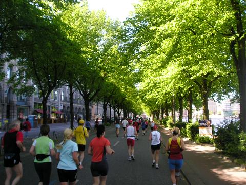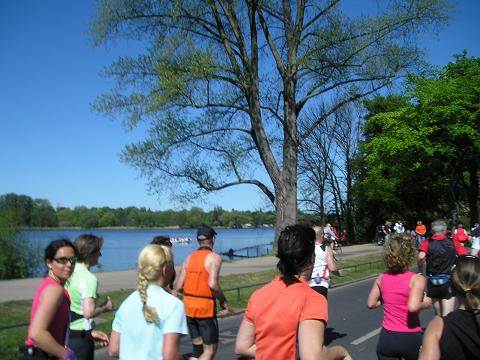 11.28 Uhr / Kilometer 20 Schöne Aussicht Der Straßenname paßt ja immer noch. :-) Der Blick nach links auf die Alster und zur Seite sowieso und dann noch nach vorne auf die in Kürze kommende Verpflegungs- stelle. Trinen, trinken und trinken waren die drei wichtigsten Dinge für mich. Denn auch wenn das Wetter bei weitem nicht so heiß war wie befürchtet, schwitzte ich doch ganz schön was aus. |