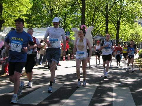 11.25 Uhr / Kilometer 19 Schöne Aussicht Der Straßenname paßt hier ja... Ein Engel auf der Straße. Mit seiner Gesichtsmaske hatte er es noch viel schwerer als ich. Am Ende kam er auch erst 80 Minuten nach mir ins Ziel. Aber er kam durch!! |