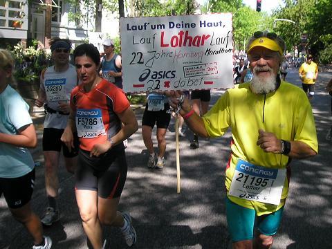 11.34 Uhr / Kilometer 20,5 Herbert-Weichmann-Straße Lothar Gehrke vom 100 Marathon Club e.V. bei seinem 22. Lauf in Hamburg. Beneidenswert. Er finishte in 5:27:03 Stunden. ich hoffe, 2035 werde ich auch noch solche Zeiten schaffen. |