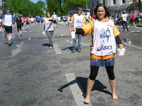 12.59 Uhr / Kilometer 33 Maienweg Und wieder eine von diesen vielen netten Verpflegungsstellen, von denen es in Hamburg insgesamt 15 gibt und wo man mich jedes Mal aufs Neue für verrückt erklärte. Für nett verrückt versteht sich. Und immerhin hat keiner mit Bananen nach mir geworfen. |