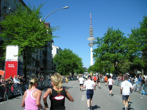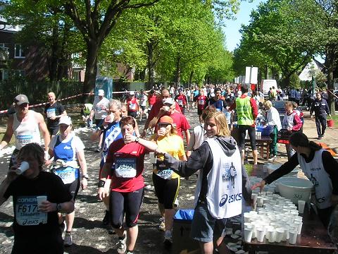 13.31 Uhr / Kilometer 38 Klosterstern Der schöne Blick zurück über die Verpflegungsstelle hinweg auf den Eppendorfer Baum. Hier tat man sich doch sehr schwer, mit dem Wasser ein paar Schritte ruhig zu gehen, wenn einen Hunderte von Menschen zum Laufen auffordern. Die meisten Flecken auf dem Fell habe ich mir wohl hier geholt. :-) |