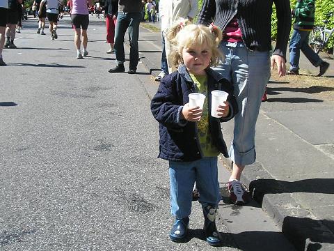 13.03 Uhr / Kilometer 33,5 Maienweg Falls jemand (warum auch immer) die große Verpflegungsstelle nicht gefunden haben sollte, so hatte er hier bei der kleineren Version eine weitere Chance auf Wasser. So wie dieser kleine Fan standen an vielen Punkten Leute, die einem Wasser oder auch Bier reichten. Und immer war die Stimmung gigantisch. |