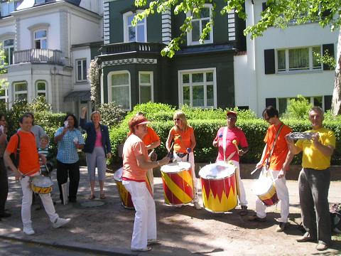 13.37 Uhr / Kilometer 39 Rothenbaumchaussee Wenn diese Trommler auch schon die ersten Läufer angefeuert haben sollten, dann wäre sie zum Zeitpunkt des Fotos fast drei Stunden aktiv. Das Durchhaltevermögen der Zuschauer ist fast ebenso zu bewundern wie das der Läufer. Alle Zuschauer hätten eigentlich auch eine Medaille verdient. |