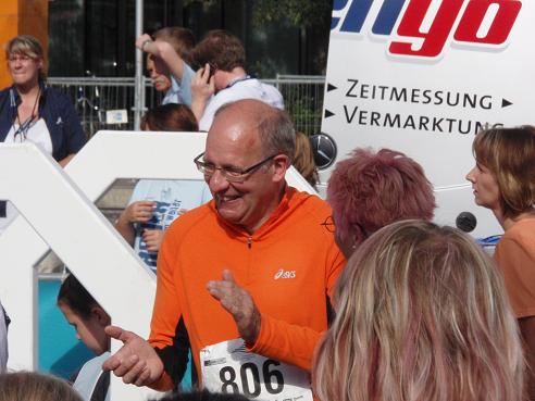 Da lacht der Oberbürgermeister von Rostock, Roland Methling. Er lief die Nautische Meile. Eine der zahllosen Strecken der Marathon- Nacht. Wie lang die Strecke der Nautischen Meile aber war, wußte allerdings niemand. 21 Starter gingen auf die Strecke. Die Hälfte davon Kinder. |