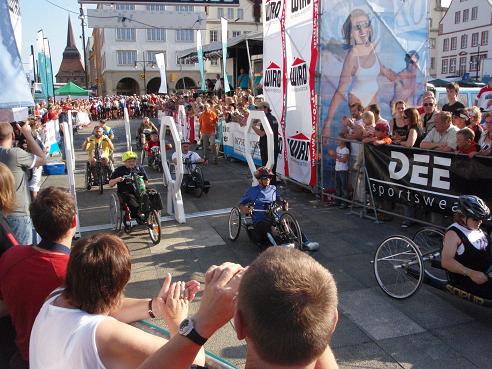 Dann gingen die Handbiker und Rollis ins Rennen. Beider aber nur auf einem Halbmarathon. Zudem gab es noch einen Halbmarathon, einen Halbmarathon für Skater, einen Run & Skate-Wettbewerb, die Marathon-Staffel, Nordic Walking Halbmarathon und zwei Kids-Marathons (4,2195 KM als Lauf- oder Skatewettbewerb). Dazu unzählige Team-Wertungen. Insgesamt gab es ungefähr 2300 Teilnehmer. 357 davon finishten beim Marathon. |