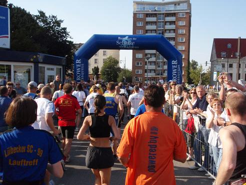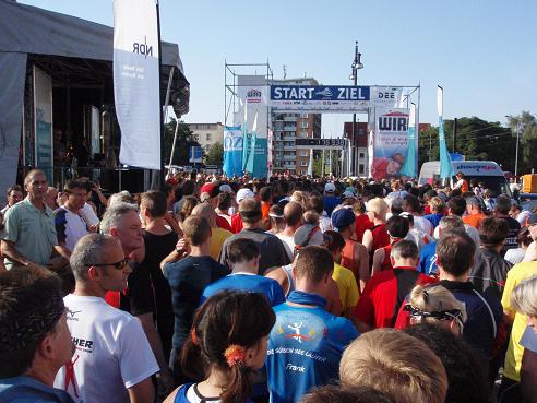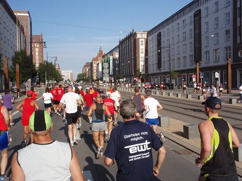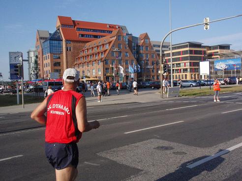 Lange Straße Kilometer 0,5 / 18.03 Uhr Zu Beginn machten wir zunächst eine kleine Runde durch die Innenstadt Rostocks. Eine Vorbereitung hatte praktisch nicht stattgefunden. Wegen viel zu großer Hitze im Ungarn-Urlaub (bis 38°C) und einer langen Erkältung war die dreieinhalb Wochen vor diesem Marathon an Training nicht zu denken. Ich war froh, rechtzeitig wieder auf den Beinen gewesen zu sein. |