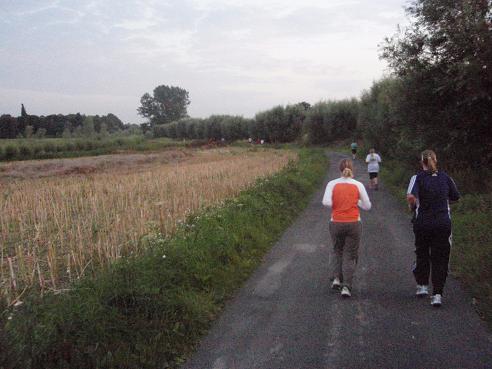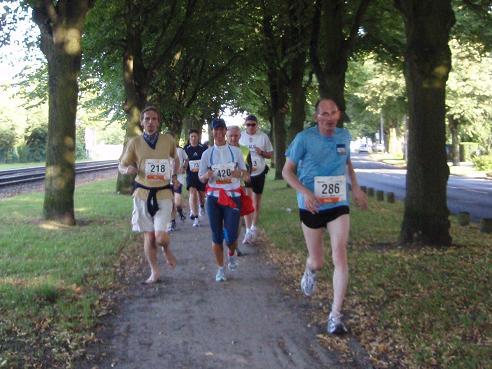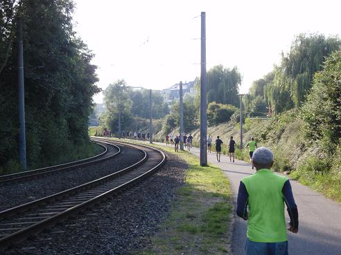 Krummendorfer Straße Kilometer 26 / 20.43 Uhr Auf schmalem Pfad ging es nun durchs Niemandsland. Hier traf ich auch auf die hintersten Läufer aus dem Halbmarathonfeld. Ein wenig erschreckend war, daß hier nach nur 5 Kilometern Halbmarathon bereits zwei Läufer in den Händen des Roten Kreuzes, bzw. auf deren Trage, landeten. |