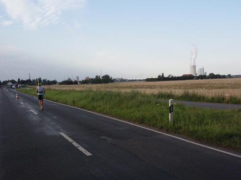 Schmarl-Dorf Kilometer 21 / 20.07 Uhr Noch so ein unfeines Novum für einen Marathon über die Erde: Es gab keine Halbmarathon-Marke. Von einer Zeitnahme ganz zu schweigen. Hier waren es noch 21 Kilometer bis zum Ziel. Da hier nur die Marathonstrecke lang führte war die Markierung ausnahmsweise mal eindeutig. Der Halbmarathon lag also knapp hinter uns. In knapp 2:06 Stunden keine so schlechte Leistung. |