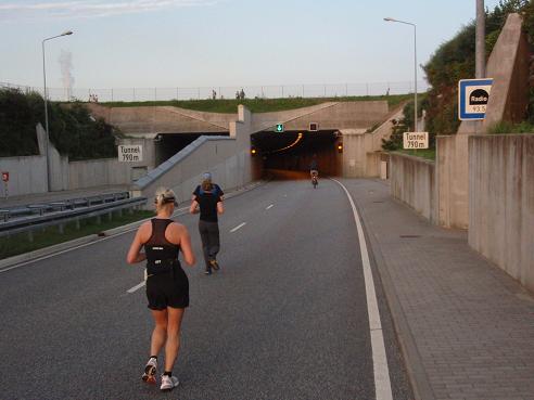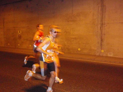 Warnowtunnel Kilometer 15 / 19.30 Uhr Im Vordergrund der spätere Sieger des Marathons. In 2:44:07 Stunden: Mathias Ahrenberg aus Schwerin. Er gewann auch schon im Vorjahr. |
