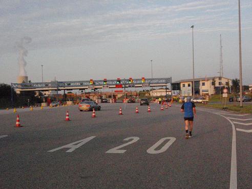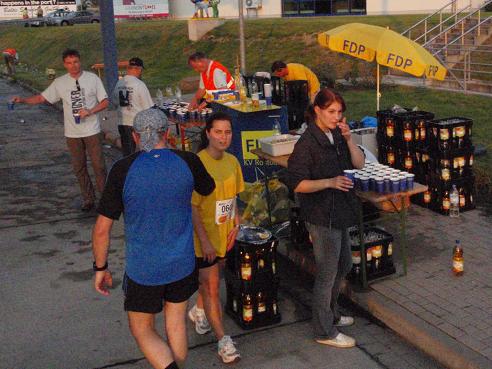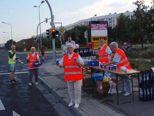 Maut-Station Warnowtunnel Kilometer 23,5 / 20.25 Uhr Bei allen Pannen, die mir bei dieser Veranstaltung über den Weg liefen, die Verpflegung gehörte nicht dazu. Schön verteilt, immer ausreichend Wasser (einziges Manko: teilweise nur mit Sprudel) und Saft oder Apfelschorle und im zweiten Teil auch Äpfel und Bananen. Und immer freundliche Leute, die einen aufmunterten. |