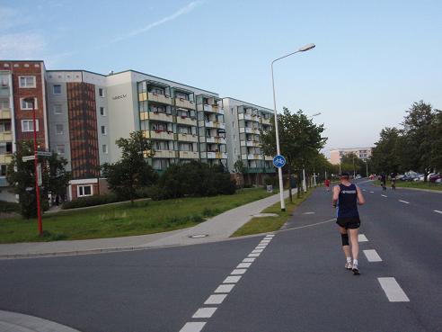 Kleiner Warnowdamm Kilometer 19 / 19.53 Uhr Der Lauf durch die Plattenbauten. So viele Anwohner hier und keiner auf der Straße. Schade. Echte Aufmunterungen bekamen Läufer nur von einigen Streckenposten, wenn gleich die meisten auch eher teilnahmslos ihren Job taten. |