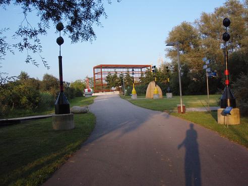 IGA Park Kilometer 20,5 / 20.00 Uhr Hier führte die Strecke kurz am Fluß Warnow entlang. Die Sonne war allmählich am Untergehen, wie man an meinem langen Schatten auf dem Foto zuvor schon erahnen konnte. |