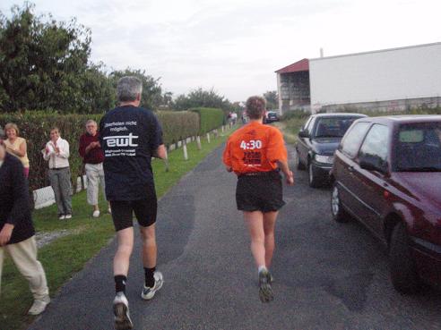 Up'n Warnowsand Kilometer 13 / 19.14 Uhr Bisweilen kam man sich doch sehr einsam und verlassen vor auf der Strecke. Die fehlenden Zuschauer wurden durch Autos ersetzt, die zum Teil mit Polizei-Eskorte am Feld der Läufer vorbeigeführt wurden. Und zum Teil auch mitten hindurch. Die Straßen waren auch immer nur halbseitig abgesperrt. Es war nicht immer so angenehm, hinter einer Autokolonne herlaufen zu müssen. |