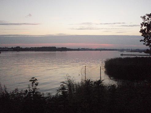 Uferpromenade Kilometer 31,5 / 21.20 Uhr Endlich zurück am Fluß Warnow. Das bedeutete gleichzeitig auch das Ende des Wald- und Wiesen-Laufs. Nun ging es bis zurück nach Rostock immer schön am Wasser entlang. Hier ein Blick über die Schulter auf die letzten Strahlen der längst untergegangenen Sonne. |