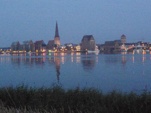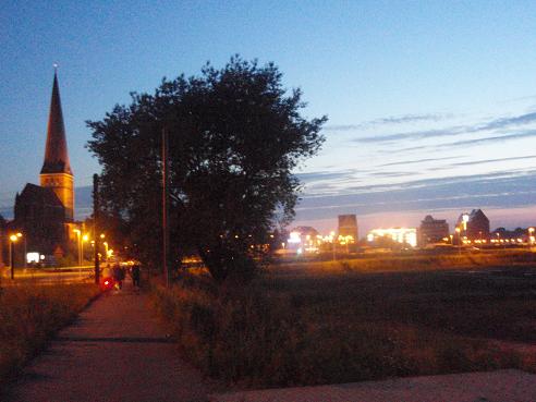 Uferpromenade Kilometer 33,5 / 21.34 Uhr Ein Blick über die Warnow auf den Hafen und die Innenstadt von Rostock. Mir ging es noch recht gut. Ich war sehr langsam unterwegs, kam nur sehr langsam von einer Gruppe Nordic Walker weg, aber es lief alles noch sehr regelmäßig und weitgehend schmerzfrei. Das Ziel, unter fünf Stunden zu bleiben, sollte kein Problem sein. |