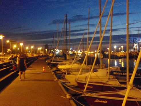 Haedgehafen Kilometer 38 / 22.12 Uhr Am Hafen angekommen stolperte man in der Dunkelheit über die vielen Kabel, die die Schiffe an das Stromnetz anschlossen. Schlimmer aber war: offenbar wurde sehr, sehr kurzfristig die Strecke geändert. Längst hätte der Wendepunkt in die Innenstadt erfolgen müssen, wo noch eine Runde gedreht werden sollte. Statt dessen ging es immer weiter in den Hafen. Und das alles ohne echte Ausschilderung und nur alle 500 Meter mal ein Einweiser. |